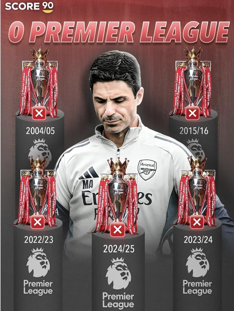 距离阿森纳上次英超夺冠已过去21年,期间球队五次收获亚军